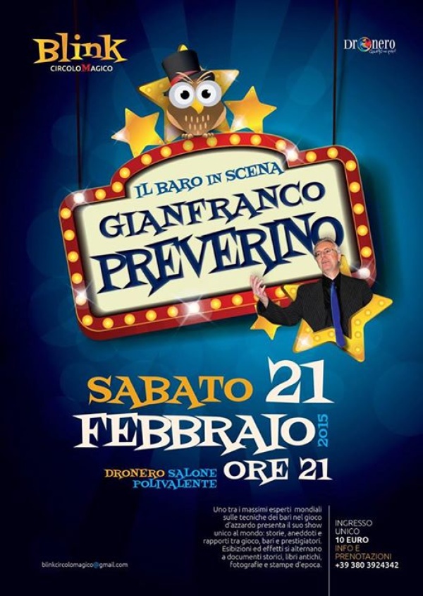 Gianfranco Preverino ospite al circolo magico di Dronero con lo spettacolo “Il baro in scena” Il mago, considerato il re dei bari, è stato bandito da tutti i casinò Ospite previsto per sabato 21 febbraio Gianfranco Preverino con lo spettacolo “Il baro in scena”: uno dei più stimati prestigiatori italiani, specializzato nella magia con le carte da gioco, considerato tra i massimi esperti mondiali di tecniche da baro nel gioco d’azzardo. Numerose anche le sue pubblicazioni.